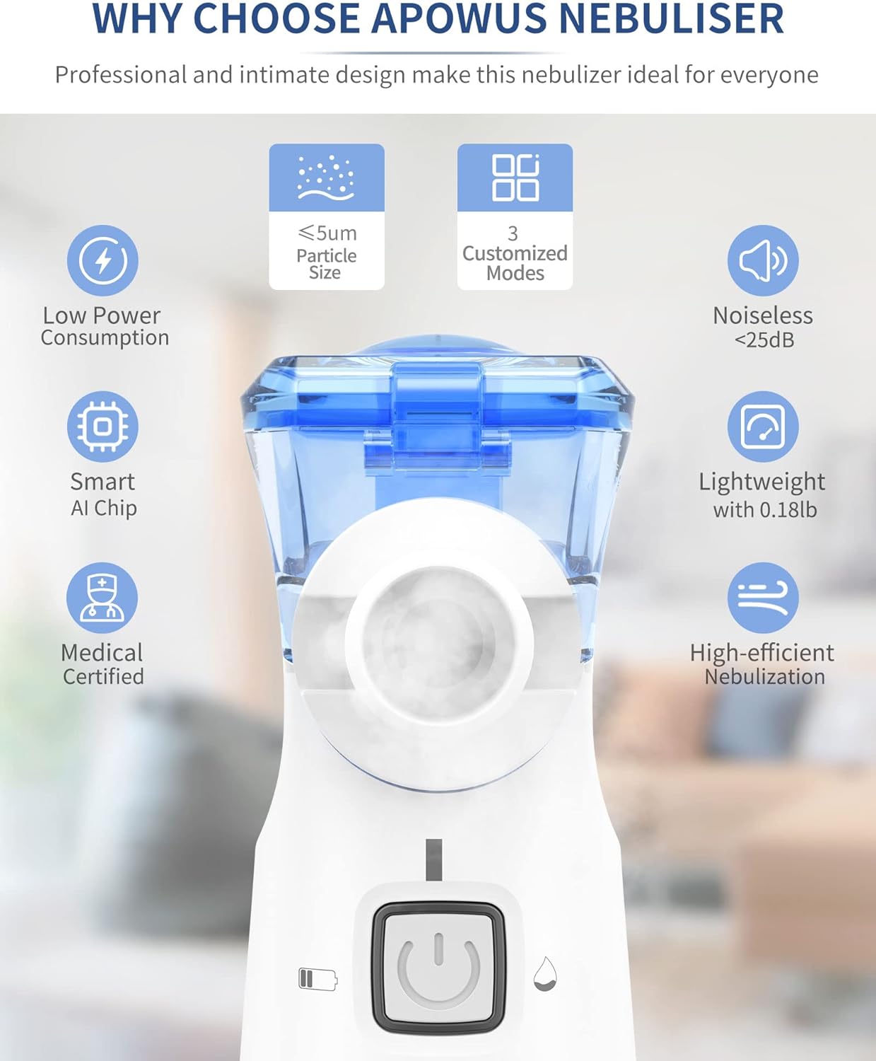 El nebulizador portátil puede cargarse fácilmente mediante cable USB-C o utilizarse con batería, brindándote total flexibilidad. Esto te permite usarlo cómodamente en casa, en la oficina o mientras viajas, sin preocuparte por la electricidad.