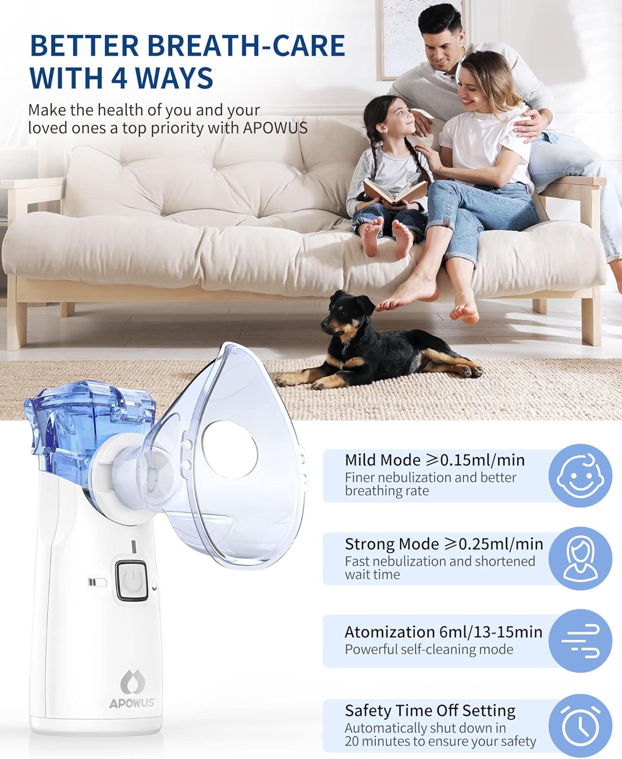 Sí. El nebulizador incluye mascarillas para adultos y niños, además de boquilla, y cuenta con modo suave y modo fuerte, adaptándose de forma segura y efectiva a cada edad.